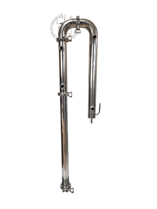 - Дефлегматор, по высоте превышающий диаметр рабочего изделия в несколько раз. Холодильник размещен наверху, за охлаждение отвечает змеевик